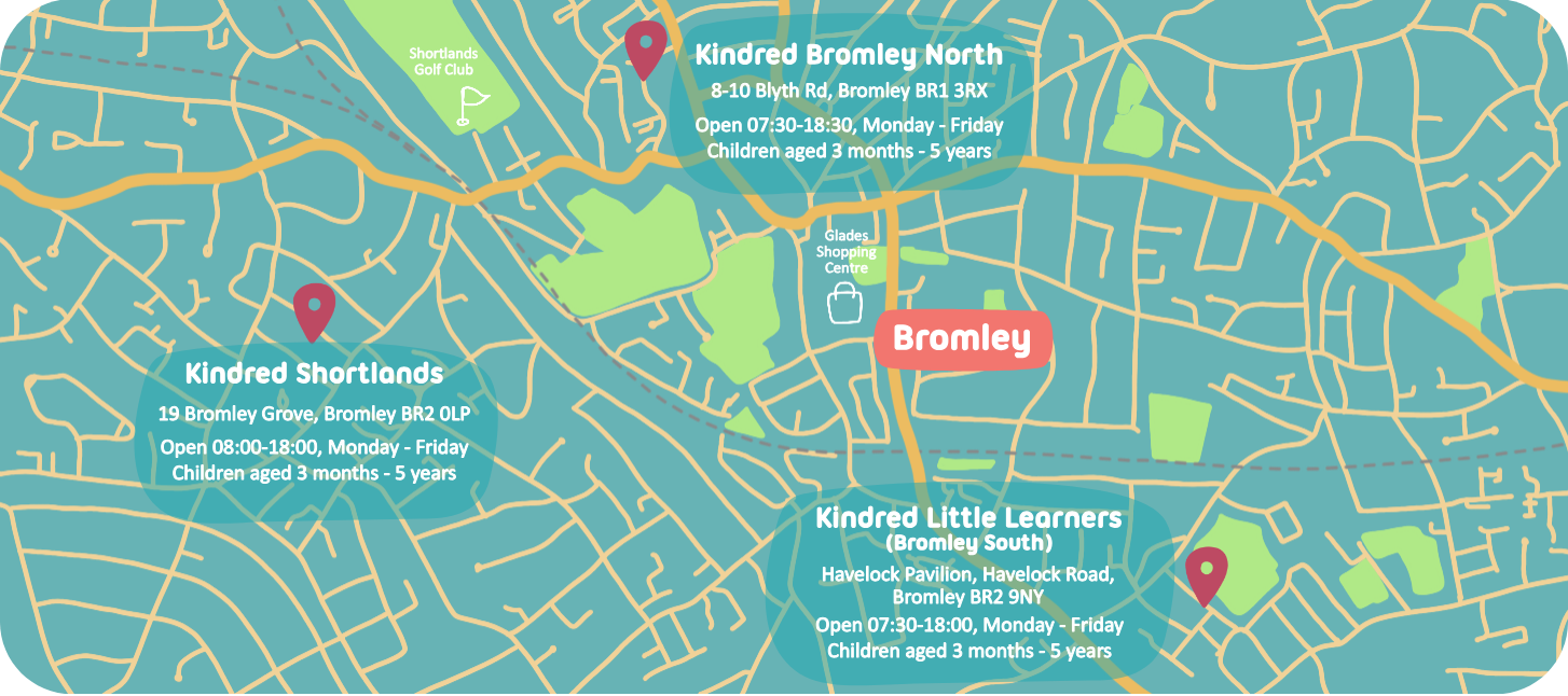 Our Bromley nurseries are inspiring spaces where little ones explore and discover at their own pace. We believe that early childhood development thrives when children are having genuine fun, so every day is filled with exciting activities designed to spark curiosity and create moments of awe and wonder. As your child enjoys these new experiences, you can stay connected to their day through our parent portal app, The Kindred Satchel, sharing in everything from their morning discoveries to the nutritious, homecooked meals they enjoy with friends.
